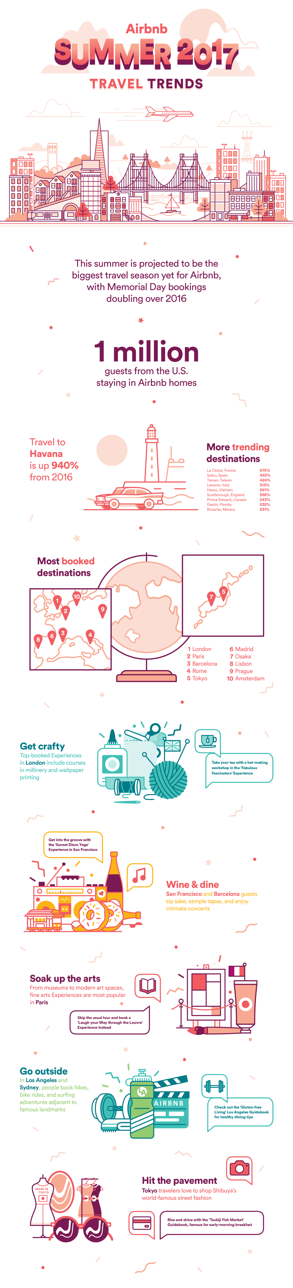 It’s hard to believe that the long, lazy days of summer are almost upon us – and in 2017, the summer season is poised to be the busiest summer yet for Airbnb. With bookings doubling over 2016, we’re projecting that this summer will be the biggest travel season yet on Airbnb by a wide margin.