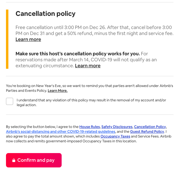 - As New Year’s Eve approaches, we are deploying more stringent restrictions on one and two-night reservations that may pose heightened risk for parties. For example, we will leverage our technology that restricts certain local and last-minute bookings by guests without a history of positive reviews on Airbnb and also block reservations within an expanded radius.