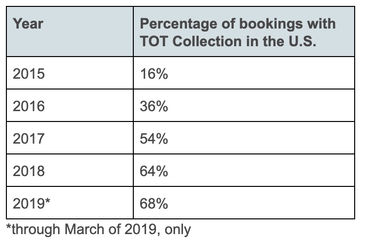 In 2014, Airbnb established its very first agreement to collect and remit hotel taxes in Portland, Oregon . Since then, our teams have worked tirelessly to establish hundreds of new agreements with local governments around the world., In 2019,  68 percent of bookings in the US i have occurred where Airbnb works with local governments to collect and remit TOT.