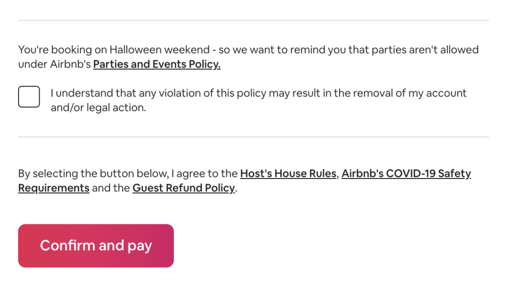 - For two-night reservations: As Halloween approaches, we will deploy more stringent restrictions on two-night reservations that may pose heightened risk for parties. For example, we will leverage our technology that restricts certain local and last-minute bookings by guests without a history of positive reviews on Airbnb and also block reservations within an expanded radius.