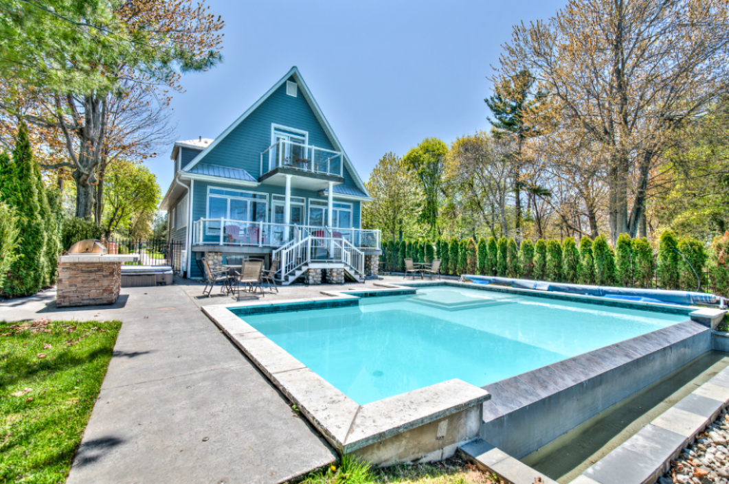 This lakefront oasis with views of the Toronto skyline is situated on the shores of Lake Ontario, and is a short drive from Niagara Falls as well as major shops and restaurants. This home can sleep up to fourteen, has parking for five, a heated pool and a fire pit perfect for making memories and roasting s’mores.