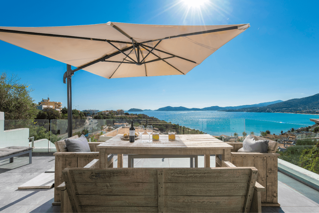 Perched on a hill above Glastres Beach, this five-bedroom villa boasts an infinity pool, kids playground, and can accommodate up to eleven people. This home also offers a special concierge service so guests can coordinate transport to and from the airport and reservedinner and water activities. Travelers can also take advantage of the nearby grocery store for home-cooked meals on the veranda overlooking the Aegean Sea.