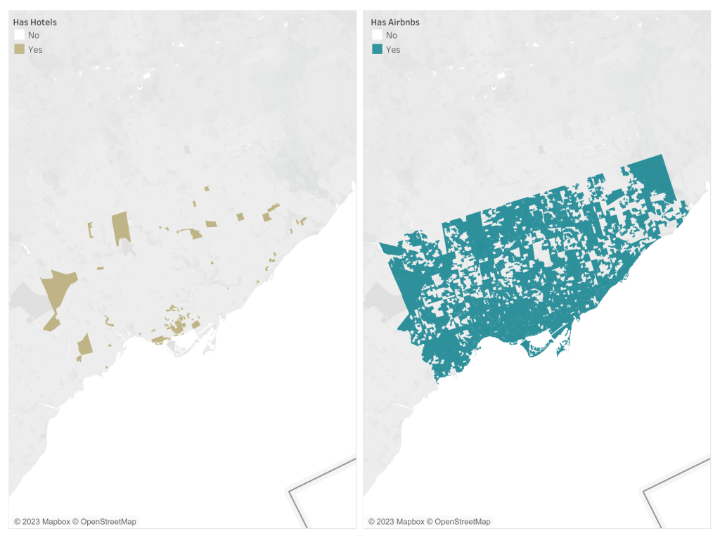 Toronto areas with hotels vs. Toronto areas with Airbnb