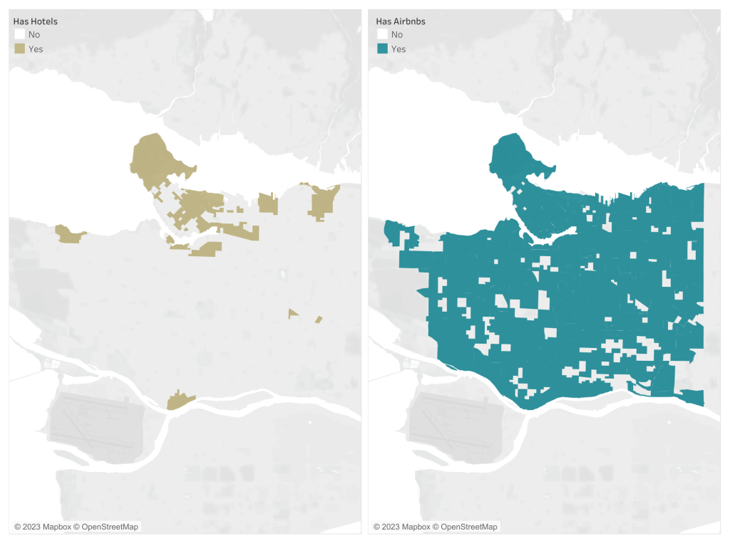 Vancouver areas with hotels vs. Vancouver ares with no Airbnbs