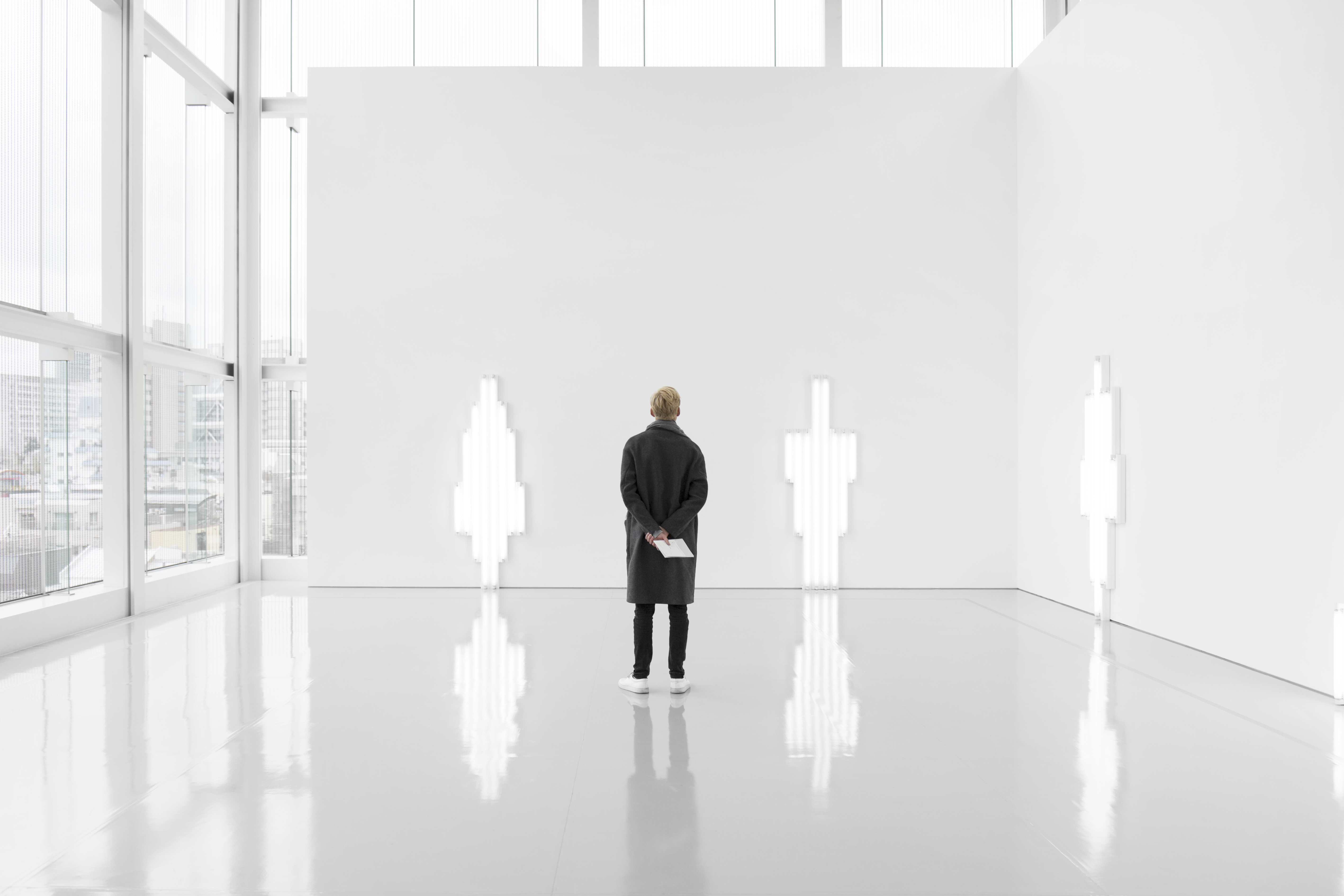 Simon begutachtet eine Ausstellung von Dan Flavin in der Espace Louis Vuitton Gallery in Tokio.
