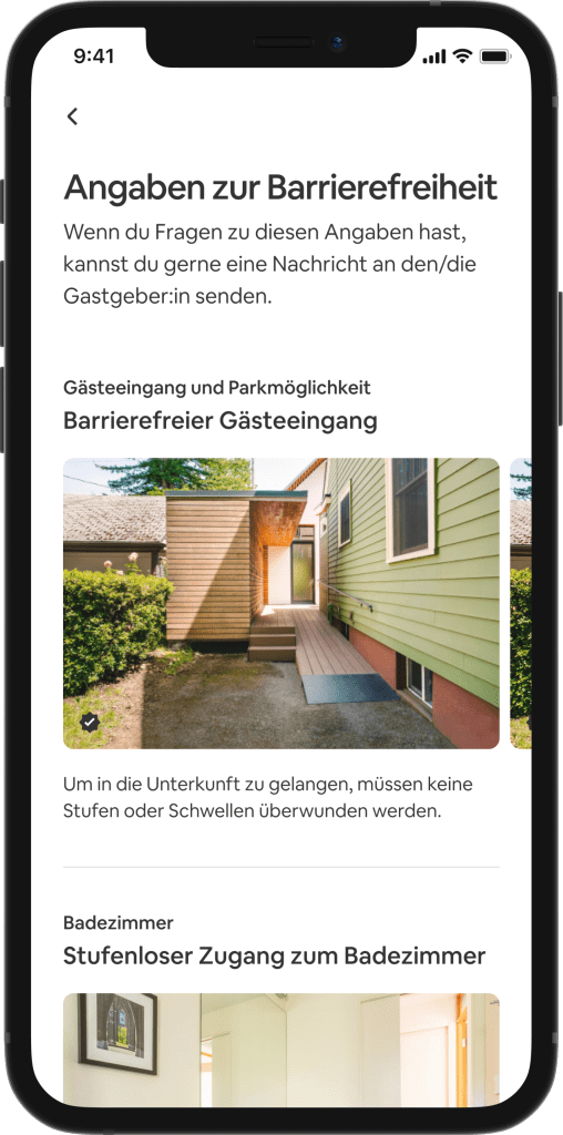 Wir haben einen branchenführenden Ansatz entwickelt, um die Genauigkeit von Ausstattungsmerkmalen, die Unterkünfte auf Airbnb für Menschen mit Behinderungen zugänglicher machen, zu überprüfen. Gastgeber:innen reichen zur Verifizierung einfach Fotos ihrer barrierefreien Ausstattung ein, die dann von Airbnb-Mitarbeitern überprüft werden: Bis heute konnte unser eigens darauf spezialisiertes Team bereits 100.000 Angaben zur Barrierefreiheit in 25.000 Unterkünften weltweit verifizieren.