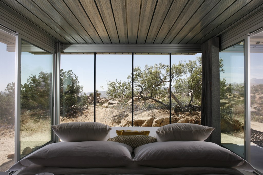 Grünes Design trifft auf industrielle Ästhetik im itHouse in der Wüste Kaliforniens. Unabhängig von Netz und Gegebenheiten befindet sich das solarbetriebene Meisterwerkeingebettet in einem abgelegenen und idyllischen Tal und gliedert sich unauffällig und doch imposant in die malerische Kulisse der Natur ein. Minimalistisch gehalten und basierend auf erneuerbaren Ressourcen verfolgte der Architekt Taalman Koch den Ansatz, einen unverwechselbaren Wohnort im Nirgendwo zu schaffen, ohne dabei die Natur zu beeinträchtigen. Das Ergebnis ist ein architektonisches Meisterwerk, das die Grenzen zwischen Natur und Industrie zu einem fließenden Übergang erstrahlen lässt.
