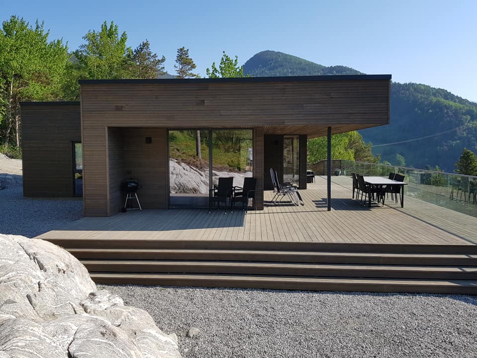 Die moderne Blockhütte in der norwegischen Provinz Rauma verfügt über alle Annehmlichkeiten, die man sich wünschen kann – und das mit einem unvergesslichen Ausblick auf die majestätischen Berge. Zudem ist sie ein idealer Ausgangspunkt für Wanderungen und Ausflüge. Herrlich entspannen lässt es sich auf der gemütlichen Terrasse, wo nur die schlagenden Wellen die Stille durchbrechen.