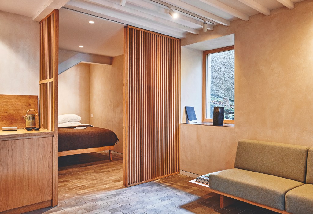 Samtigwarme Kalkstein fliesen auf dem Boden, weiß gestrichene Holzbalken an der Decke und lehm verputzte Wände schaffen die Atmosphäre eines Designer-Cottages, das genauso an einer rauen, schottischen Küstenklippe stehen könnte. Und tatsächlich steckt in den 36 Quadratmetern, die die beiden als Ferienunterkunft vermieten, mehr Natur Schottlands, als man denkt: Aus einer einzigen, alten Eiche aus East Lothian, dem Küstenstreifen östlich von Edinburgh, haben Eilidh und Jack die gesamte Ausstattung des Apartments schreinern lassen.