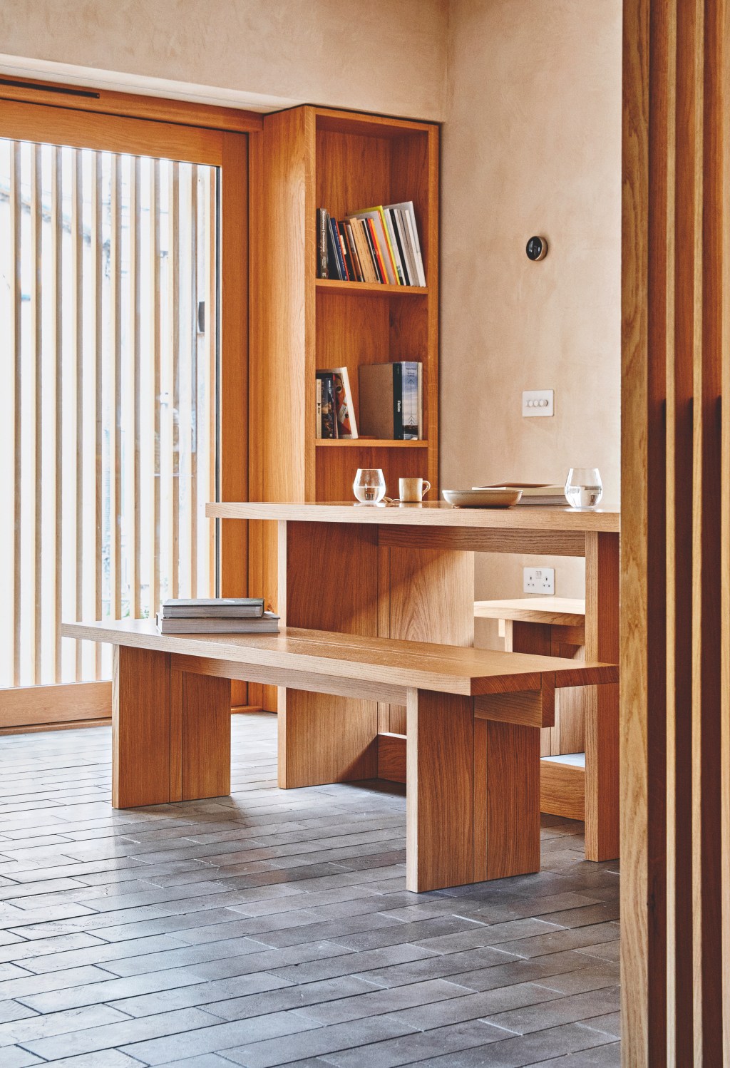 Die Bad-und Küchenzeile, der große Tisch mit Sitzbänken, zwei Regale, das Bett, das Sofa, selbst die Rahmung und Strebender Glasfront haben denselben Ursprung, dieselbe Maserung, die sich durch das Holz zieht. Im Oktober 2016 kauften Eilidh und Jack die ehemalige Hinterhofgarage. Das Apartment wurde komplett entkernt, ein neues Fenster aus der dicken Backsteinwand gebrochen und jedes Detail genau durchdacht. Was Eilidh und Jack nicht selbst schafften, übernahmen Freunde aus der Gegend: Die Holz arbeiten stammen vom ortsansässigen Tischler Namon Gaston, das handgetöpferte Geschirr von Rebecca Proctor aus Cornwall.