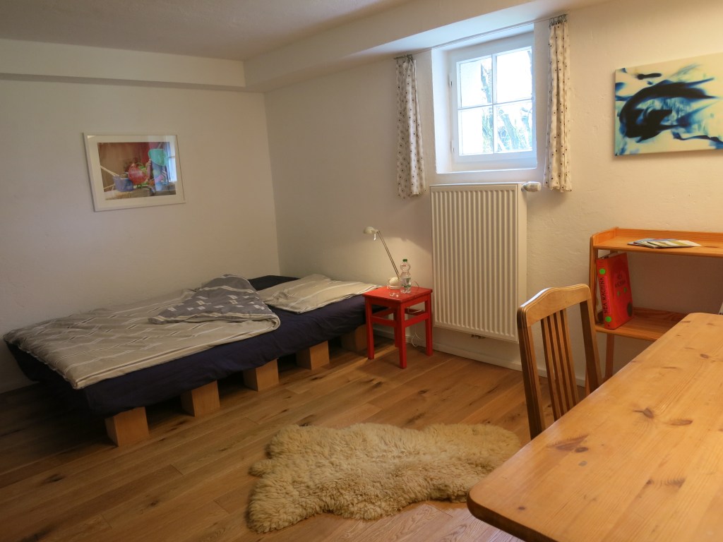 „Zur Messezeit kosten Hotelzimmer in der Umgebung rund 150 Euro. Wir können nicht mit Luxus auffahren, aber wir können Gästen die umliegende Natur empfehlen und mit dem ein oder anderen trinken wir abends gerne ein Glas Wein”, erzählt Alex. Die Zeiträume, in denen sie die Wohnung privat nutzen möchten, können sie flexibel entscheiden, etwa wenn die Kinder zu Besuch sind. Auch wenn das Zimmer schlicht gehalten ist, eignet es sich durch den privaten Eingang hervorragend für Gäste und gewährt der Familie und Gästen trotzdem die gewünschte Privatsphäre.