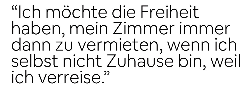 “Die Preise waren in München schon immer sehr hoch und Homesharing ist für viele Menschen in München eine Möglichkeit die hohen Kosten zu stemmen. “Ich finde es nicht fair, dass nur große Unternehmen und Hotel- und Restaurantketten am Tourismus verdienen.”
