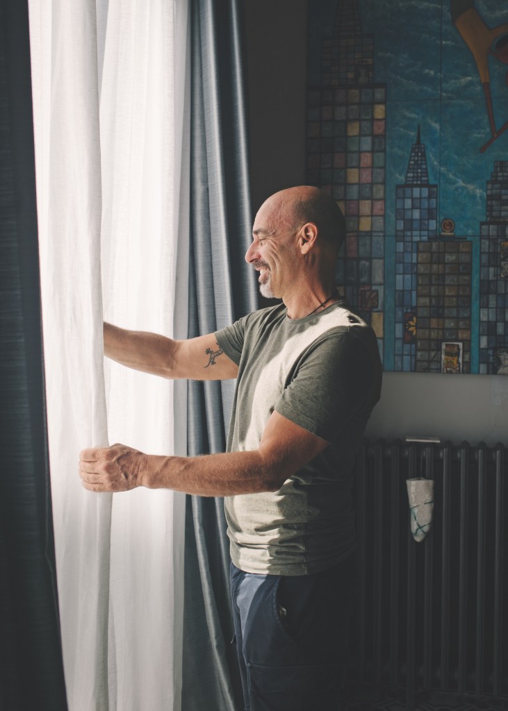 Darunter versammelt sich ein eklektischer Möbel-mix: alte Schränke vom Tabakladen nebenan, die Antonio vor dem Sperrmüll rettete, eine dunkle Tapete aus dem Theater, vor der ein quietschpinkes Fahrrad der Kinder parkt, und handgefertigte Kissen von einem befreundeten Händler. Im großen Wohnzimmer, kann man die mitreißende Energie spüren, die aus all dem Alten entsteht, das hier in neuer Funktion zusammenkommt. „Man muss sich das vorstellen: Ich bin ein Touristenbootkapitän, aber lebe in einem Palazzo. Das ist Palermo.“ Vor einem der bunten Kunstwerke an den Wänden seiner Wohnung kommt Antonio zum Stehen. Den Künstler kennt er persönlich. „Die Gemeinschaft in Palermo hört nicht mit den eigenen vier Wänden auf. Das ganze Viertel ist unser Zuhause. Und wir versuchen mit unseren Möbeln und den Kunstwerken, ganz Sizilien unsere Wohnung zu holen.“
