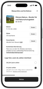 1 Die Option „Jetzt buchen, später bezahlen“ wird für alle Nutzer:innen verfügbar sein, mit Ausnahme solcher, die in brasilianischen Real (BRL), indischen Rupien (INR) oder türkischen Lira (TRY) bezahlen.