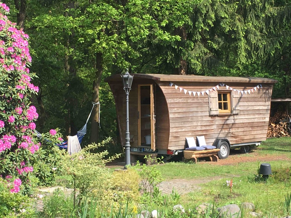 Dieser hölzerne Schäferwagen in Neu Wulmstorf vor den Toren Hamburgs liegt abgelegen auf einem wunderschönen, naturbelassenen Waldgrundstück. Ob Frühstück im Morgengrauen am großzügigen Holztisch, Nachmittagskaffee in den Liegestühlen oder abends Schmökern in der Hängematte: Der Außenbereich der wunderbaren Unterkunft lässt keine Wünsche offen.