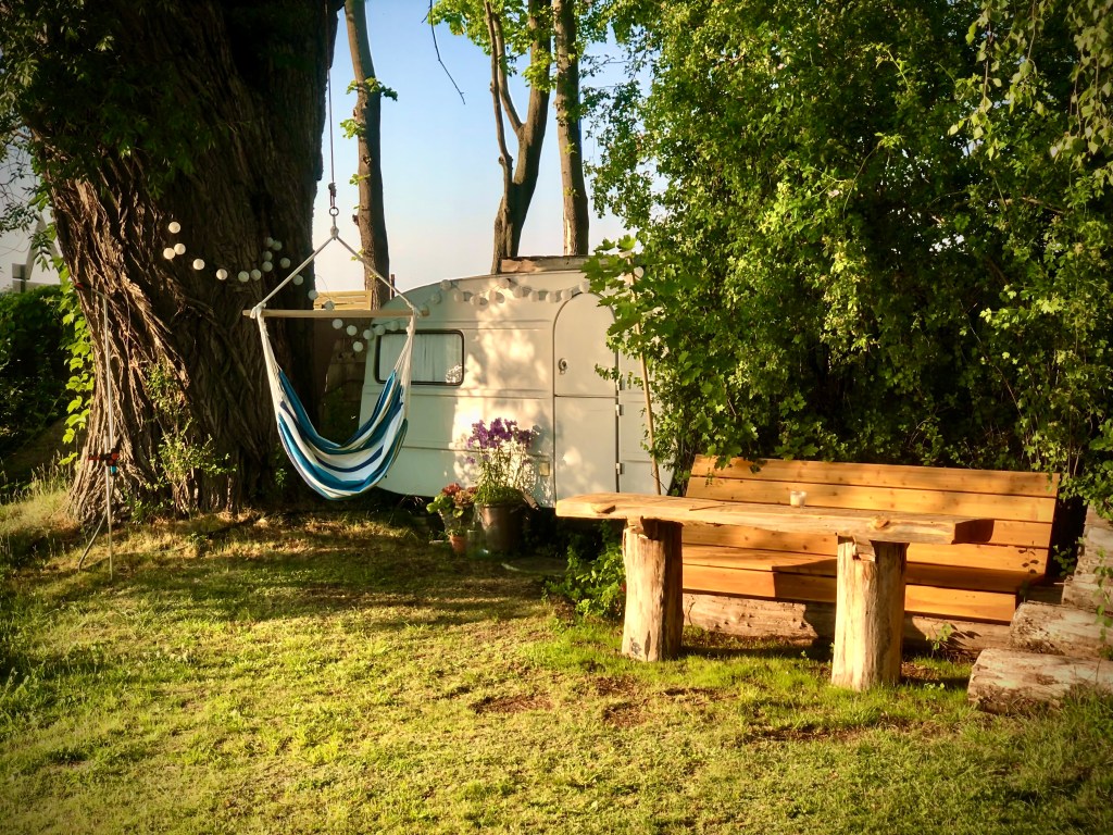 Liebevoll eingerichteter Wohnwagen mit Open-Air-Kino