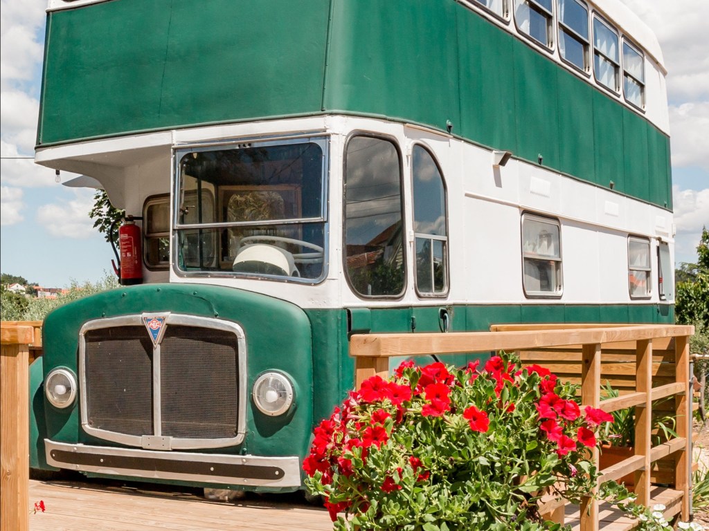 Der schöne und luxuriöse Doppeldecker-Campingbus steht im sonnigen Leiria in Portugal. In seinem hell gestalteten Innenbereich befinden sich unter anderem ein geräumiges Bad und ein großes Doppelbett. Der Außenbereich verfügt über einen Pool, eine Hängematte und eine große Terrasse mit Grill.
