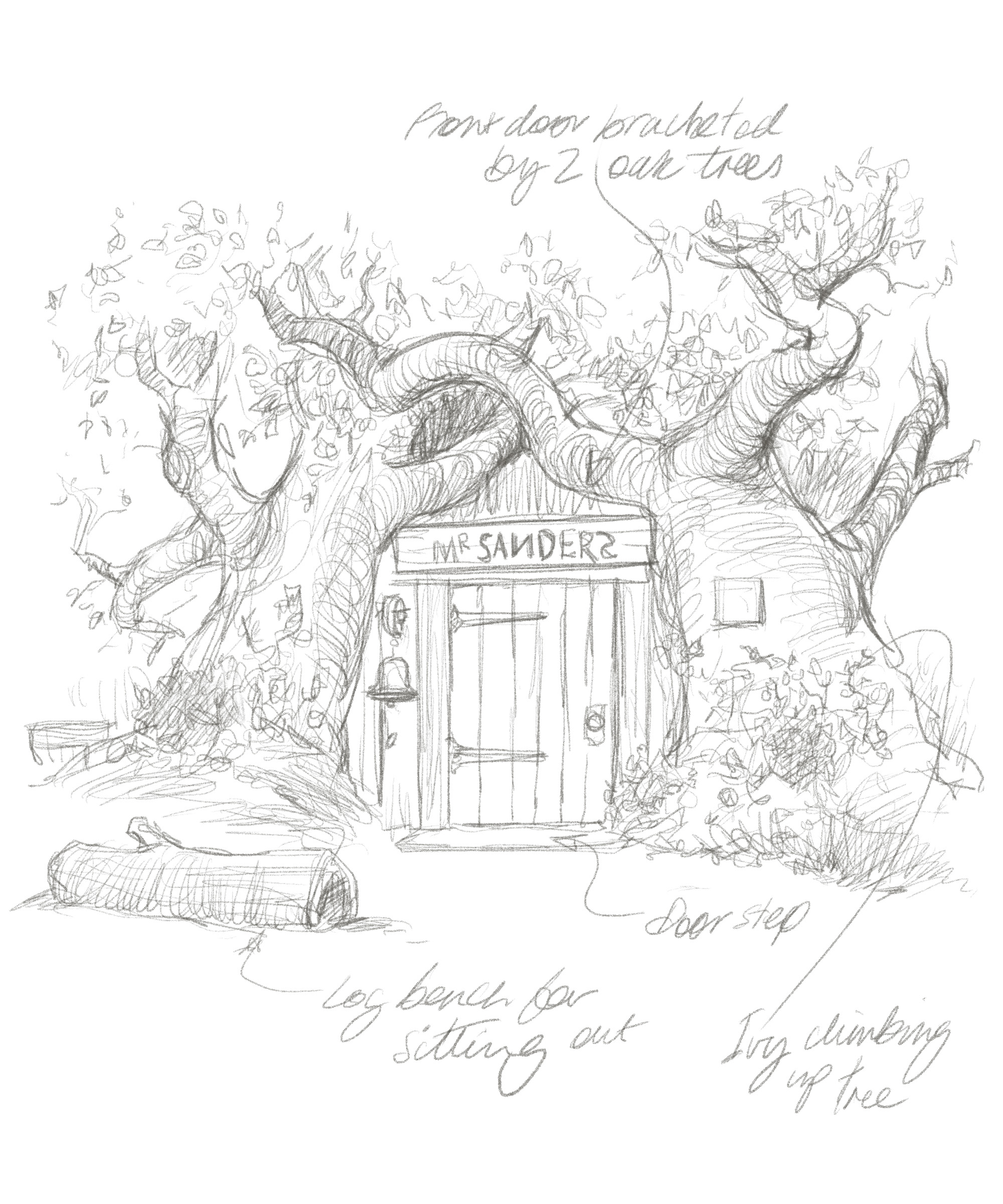 - La casa está construida con ramas de árbol expuestas que rodean la puerta que tiene una inscripción arriba en la que se lee “Sr. Sanders”.