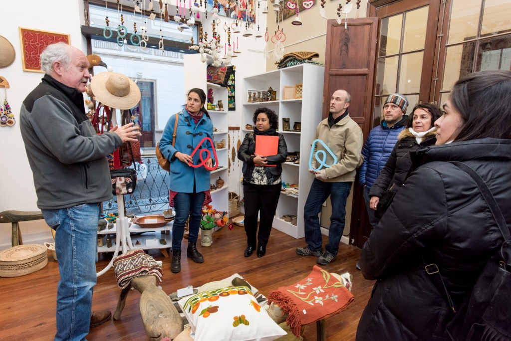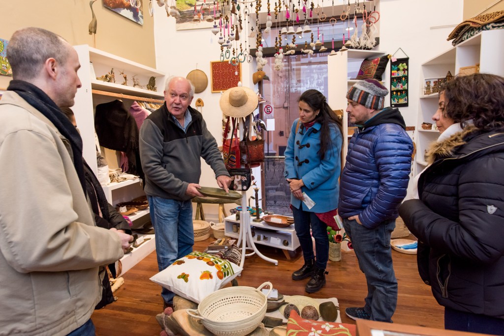 En esta oportunidad, el recorrido empezó en VinculArte, un espacio que reúne trabajos realizados por artesanos de las comunidades indígenas y campesinas del noroeste argentino. Allí los recibió el sociólogo rural Chris van Dam, quien ideó el proyecto para visibilizar la riqueza artesanal de los pueblos originarios del noroeste argentino entre quienes visitan la ciudad y darles la posibilidad a esos artesanos de acceder al mercado en condiciones de equidad.