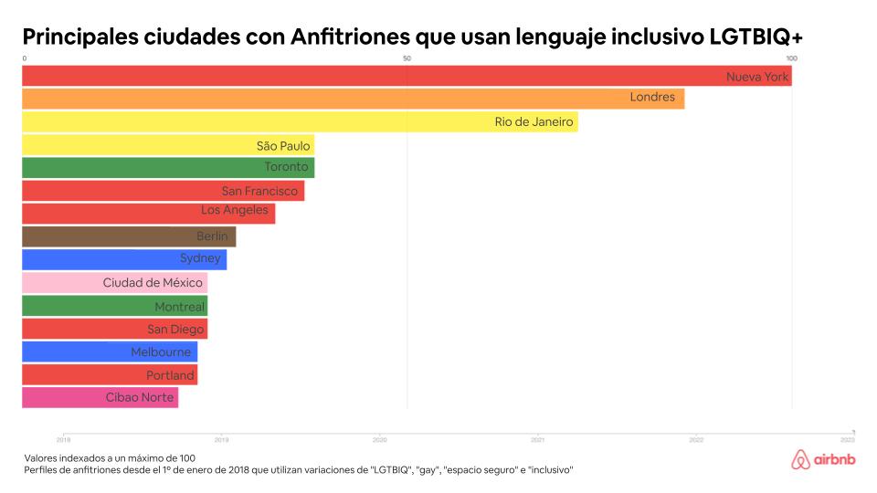 Como reflejo de este compromiso, la plataforma ha visto un aumento significativo de aproximadamente un 90 %, casi duplicando la cantidad total de Anfitriones que utilizan un lenguaje inclusivo LGTBIQ+ en sus perfiles y promoviendo aún más la pertenencia dentro de nuestra comunidad global1. São Paulo, Rio de Janeiro y Ciudad de México se encuentran dentro de las ciudades con más Anfitriones que utilizan lenguaje LGTBIQ+ en sus perfiles2.