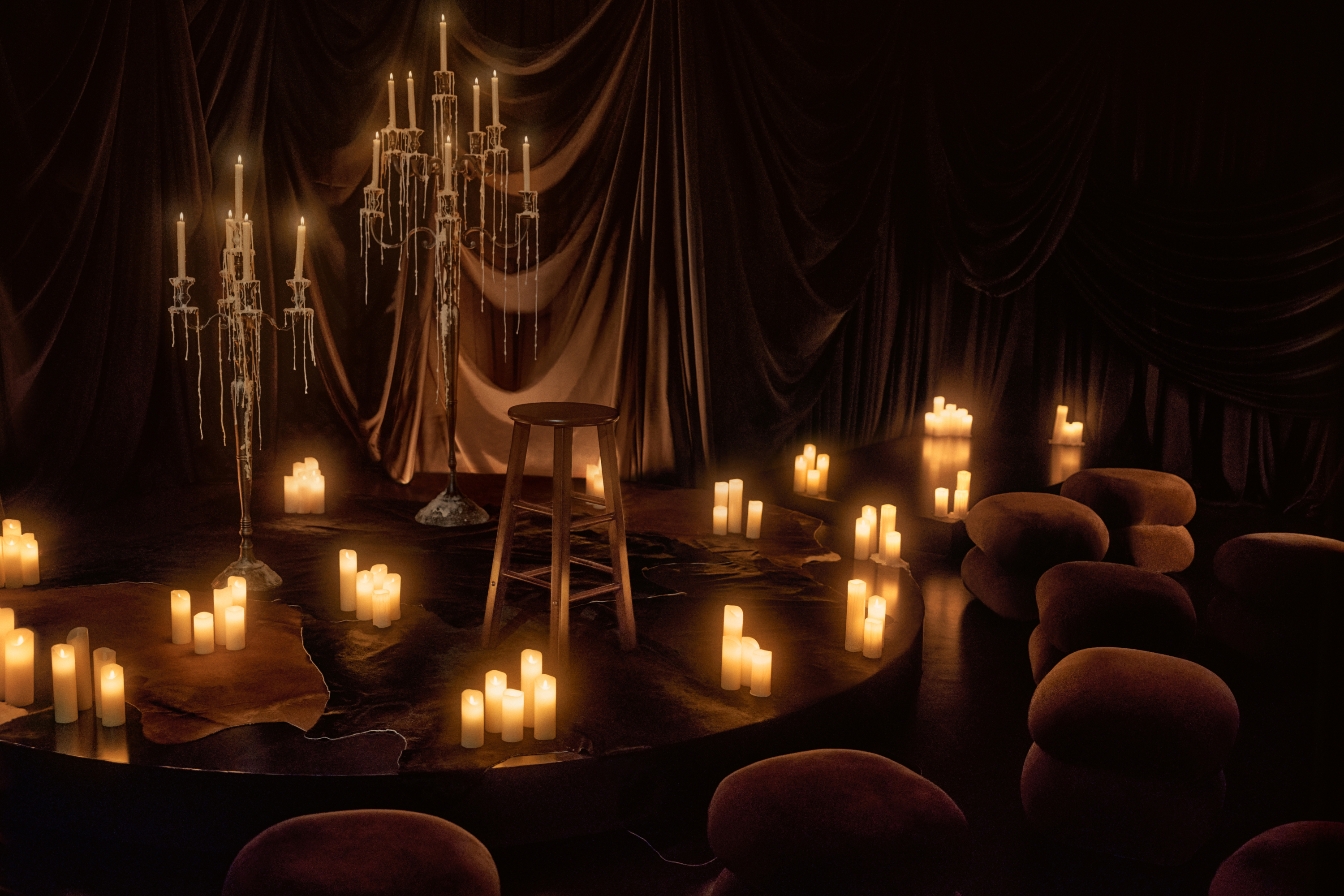 La visión creativa de Doja fue hecha realidad en este espacio personal complementado con el arte hecho a mano de su abuela, un banquete de lujo y una playlist para prepararse antes de que Doja se suba al escenario de la sala para una presentación unplugged.