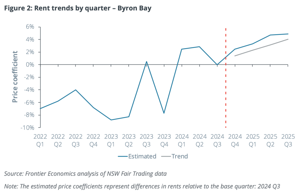 Frontier Economics’ analysis of publicly available rental bond data shows median rents in Byron Bay have been consistently above those in Greater Sydney.