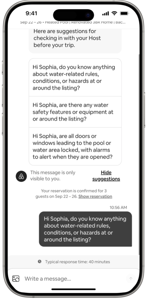 This feature is shown to the booking guest once the reservation is confirmed. The guest will see automated prompts by Airbnb suggesting questions to ask their host about the listing and its water safety features. Prompts include questions about safety equipment at the listing, access points to the pool or waterfront areas, and water-related rules, conditions, or hazards at or around the listing.