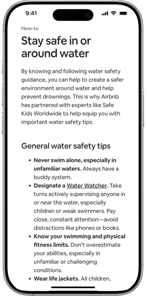 After a guest books a listing with a pool or near the water, our new in-app experience will surface expert-developed water safety tips and prompt suggested questions they can ask their host about the listing’s water safety protections and considerations.