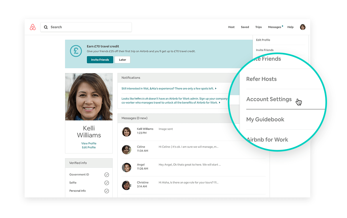 1. From the Airbnb home page, click on your profile picture at the top of the page to reveal a drop-down menu. Select “Account Settings” or “Settings”
