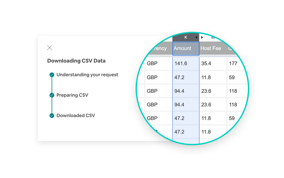 6. Open the CSV file in your preferred spreadsheet application. To calculate your earnings from hosting, add up all the numbers in the “Amount” column. The numbers in the Amount column represent your Gross Earnings (the listed price of your Experience) minus the Host Fee (the Airbnb service fee).
