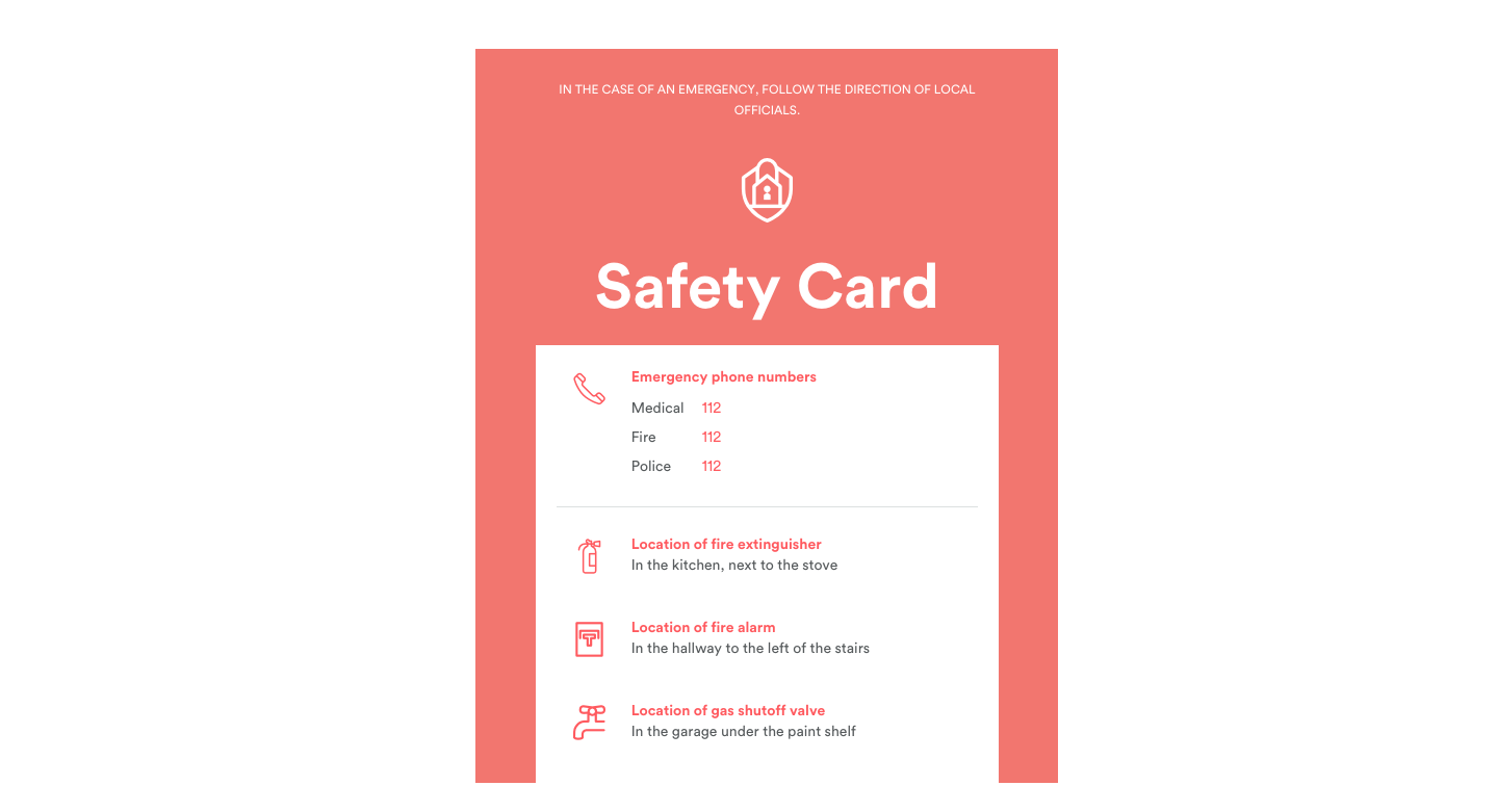 In conjunction with the European Emergency Number Association, we’ve developed a home safety card that hosts should complete for guests which includes contact information of emergency services together with an evacuation map for hosts to fill out. That way, your guests can have the safety information they need right in the palm of their hand or printed and waiting for them in your listing (…or both!).