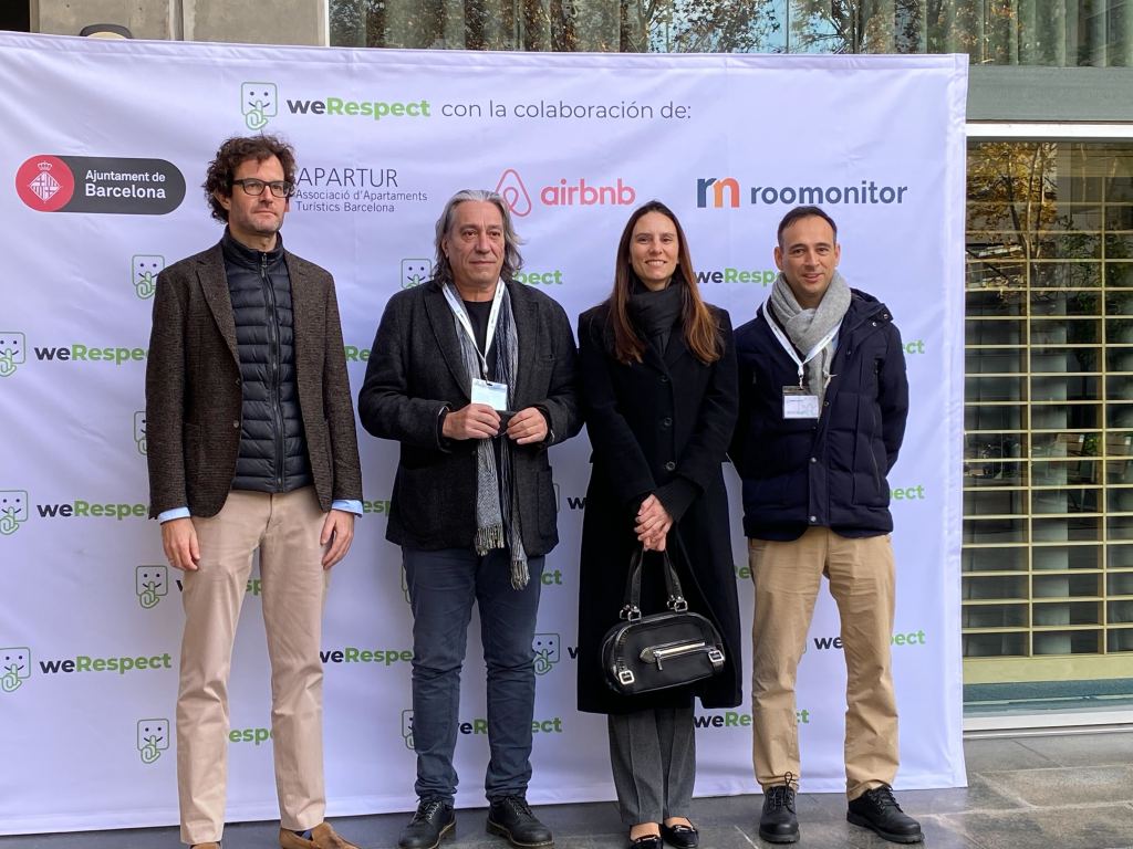 De izquierda a derecha: Ignacio Suárez, CEO de Roomonitor; Xavier Marcé, regidor de Turisme i Indústries Creatives de l’Ajuntament de Barcelona; Mónica Casañas, directora general de Airbnb Marketing Services SL; Enrique Alcántara, presidente de Apartur.