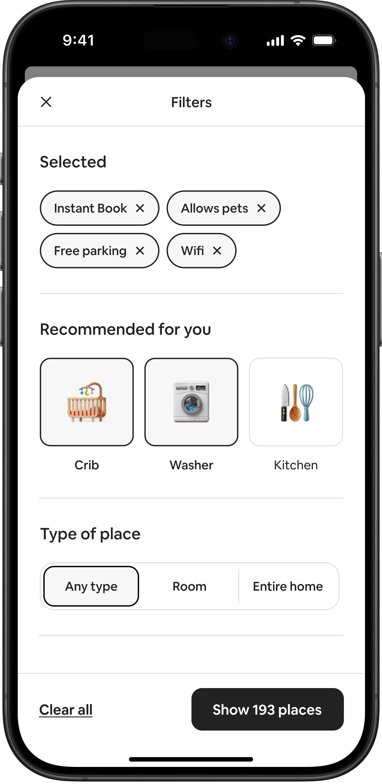 - Mise en avant de détails de l’annonce pertinents pour le voyageur : lorsque vous consultez une annonce, nous mettons en évidence les détails pertinents pour votre recherche, comme une salle de jeux ou un jardin lorsque vous voyagez avec des enfants.