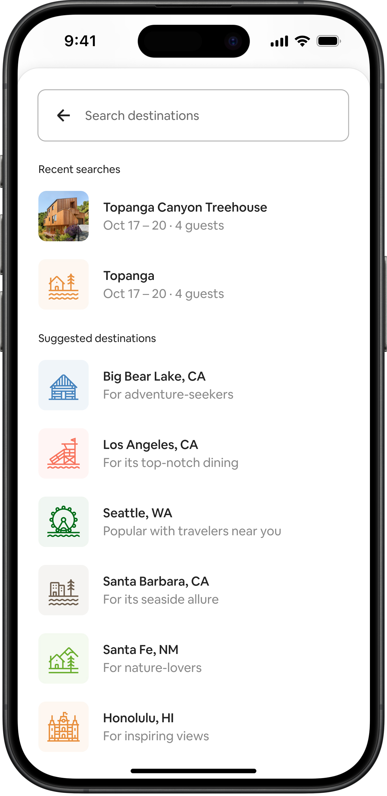 - Destinations recommandées : lorsque vous appuyez sur la barre de recherche, nous vous recommandons des destinations en fonction de votre historique de recherche et de réservation. Nous vous proposons également des raccourcis vers vos recherches passées et les annonces récemment consultées.