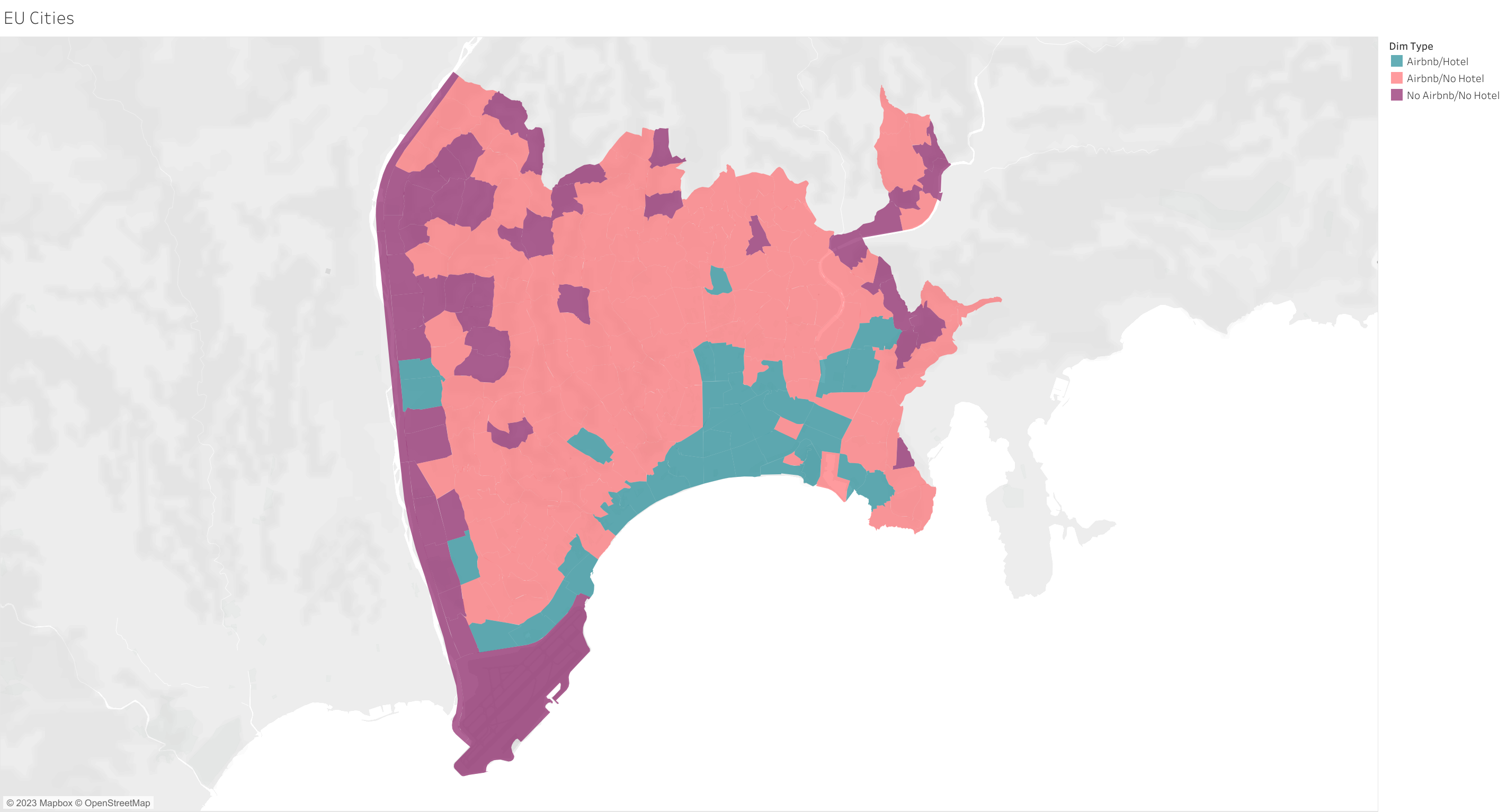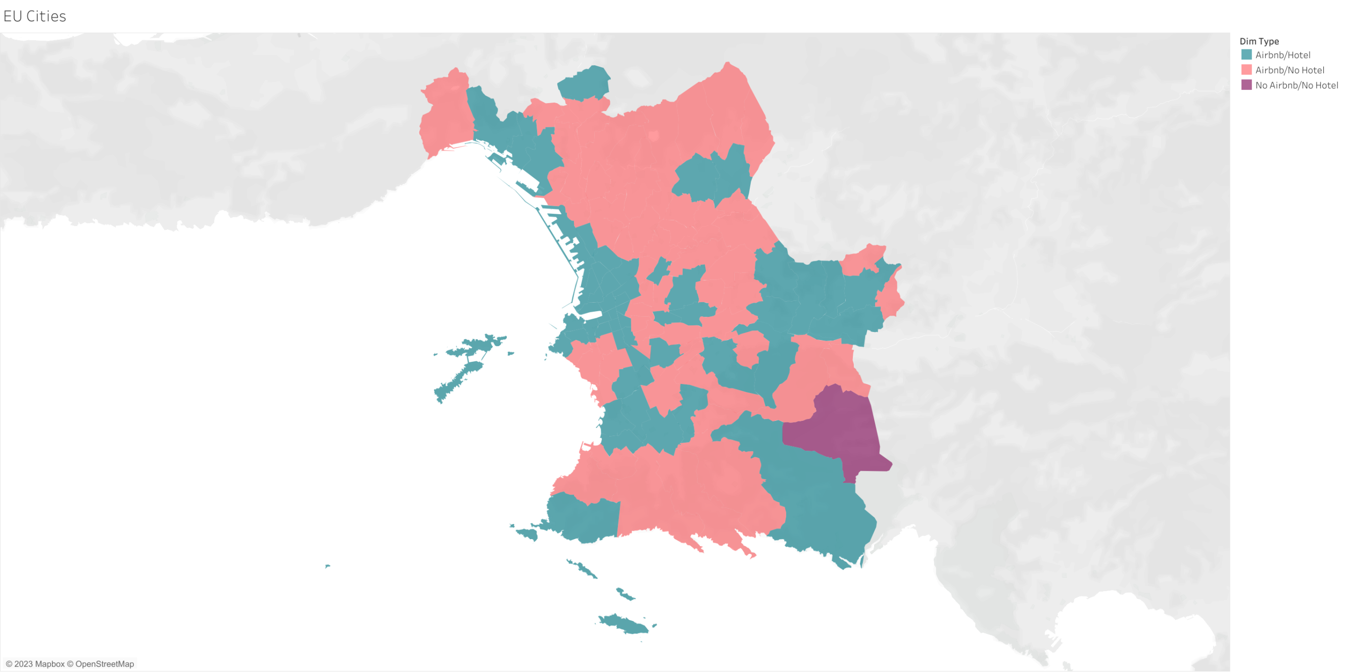 • En rose – présence d’annonces sur Airbnb, pas d’hôtel