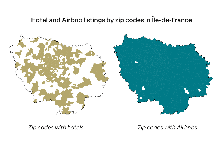 L’impact positif d’Airbnb sur la dispersion du tourisme s’observe dans les villes, mais aussi dans les régions touristiques populaires. Dans la région la plus peuplée de France, l’Île-de-France, l’offre hôtelière est concentrée dans la moitié des codes postaux, tandis que les hôtes sur Airbnb proposent des hébergements dans 99 % des codes postaux, selon une étude récente réalisée par Deloitte. L’étude révèle également que les hôtels ont tendance à se concentrer dans les zones à plus forte densité et à plus forte activité économique, tandis qu’Airbnb couvre une zone géographique plus large, comme le montre la comparaison ci-dessous.
