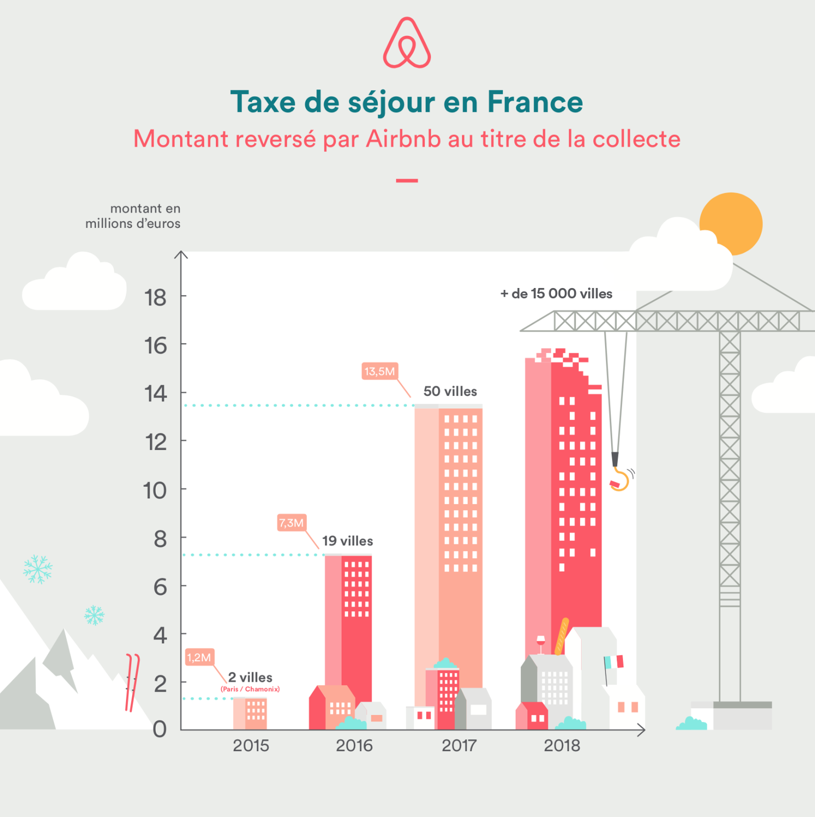Airbnb reversera d’ici la fin du mois plus de 13,5 millions d’euros de taxe de séjour à 50 villes françaises, soit deux fois le montant versé en 2016 (7,3 millions d’euros). Prochaine étape : Airbnb généralisera la collecte automatique de la taxe de séjour à plus de 15 000  communes, devenant ainsi la première plateforme de location meublée touristique à contribuer aussi massivement aux finances des collectivités locales. Ces ressources supplémentaires seront investies par les communes dans des projets de développement touristique. Airbnb contribue ainsi à l’attractivité de la destination France.