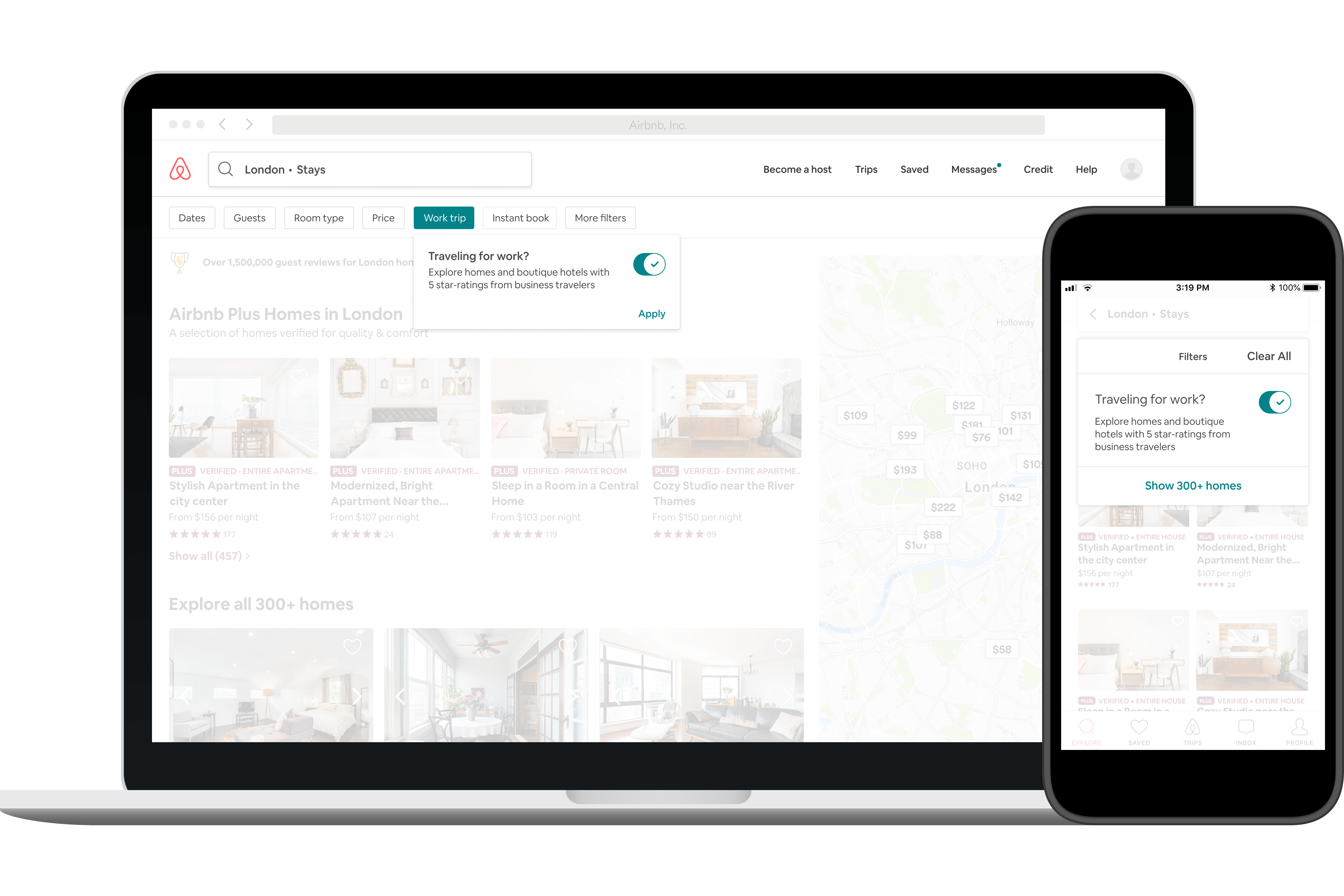 Sur le web, le mobile et dans toutes les applications d’Airbnb, le nouveau filtre « voyage d’affaires » permet aux voyageurs de nous faire savoir quel type de séjour ils entreprennent lorsqu’ils cherchent un hébergement.