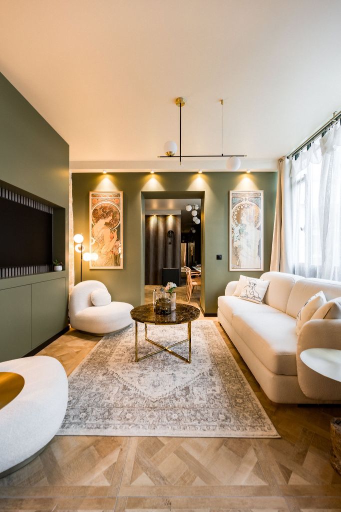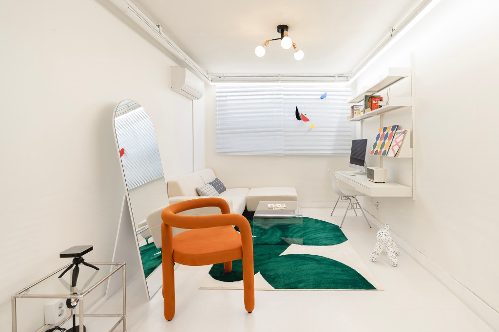 Un logement confortable où la couleur contraste avec les tons blancs, reflétant parfaitement les tendances de cette saison.