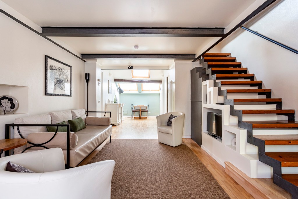 Cet appartement de style loft dispose d’un mobilier design, ainsi que de pièces de décoration vintage, ce qui lui confère un charme unique, tout en offrant tout le confort moderne. Les motifs et les couleurs audacieuses suivent les tendances de la saison.