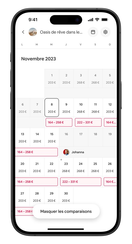 - Comparaison des prix : les hôtes pourront comparer le prix de leur annonce à ceux d’annonces similaires directement dans le calendrier, pour suivre plus facilement les tendances de prix dans les environs de leur logement.