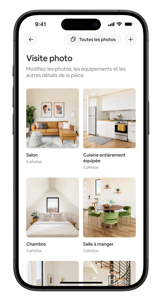 - Visite photo assistée par l’intelligence artificielle (IA) : les hôtes peuvent créer une visite photo instantanément. Les photos sont alors organisées par pièce afin d’aider les voyageurs à se faire une idée de l’agencement du logement. La visite photo est assistée par l’IA d’Airbnb, formée par plus de 100 millions de photos, qui reconnaît les photos et les attribue à 19 types d’espaces de vie en quelques secondes. Les hôtes peuvent modifier leur visite photo à tout moment et ajouter des équipements à chaque pièce.