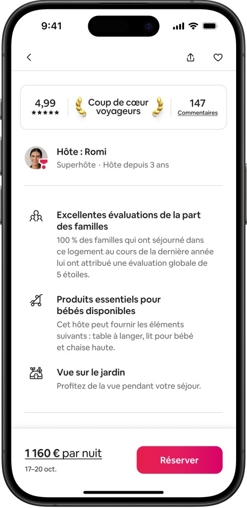 - Mise en avant de détails de l’annonce pertinents pour le voyageur : lorsque vous consultez une annonce, nous mettons en évidence les détails pertinents pour votre recherche, comme une salle de jeux ou un jardin lorsque vous voyagez avec des enfants.