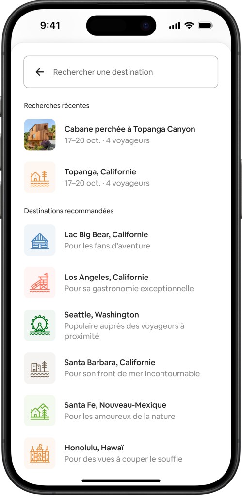 - Destinations recommandées : lorsque vous appuyez sur la barre de recherche, nous vous recommandons des destinations en fonction de votre historique de recherche et de réservation. Nous vous proposons également des raccourcis vers vos recherches passées et les annonces récemment consultées.