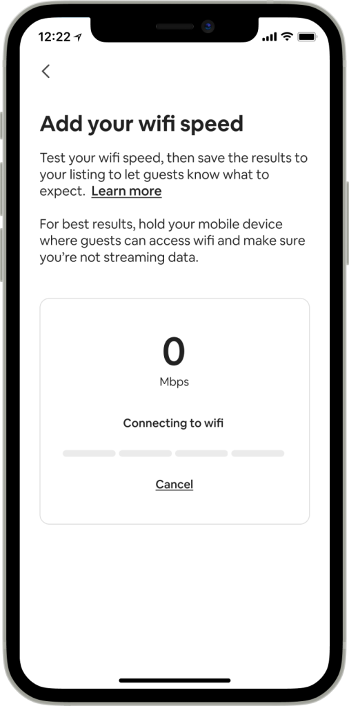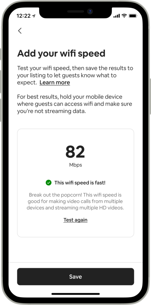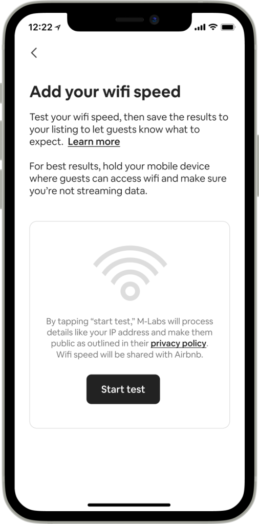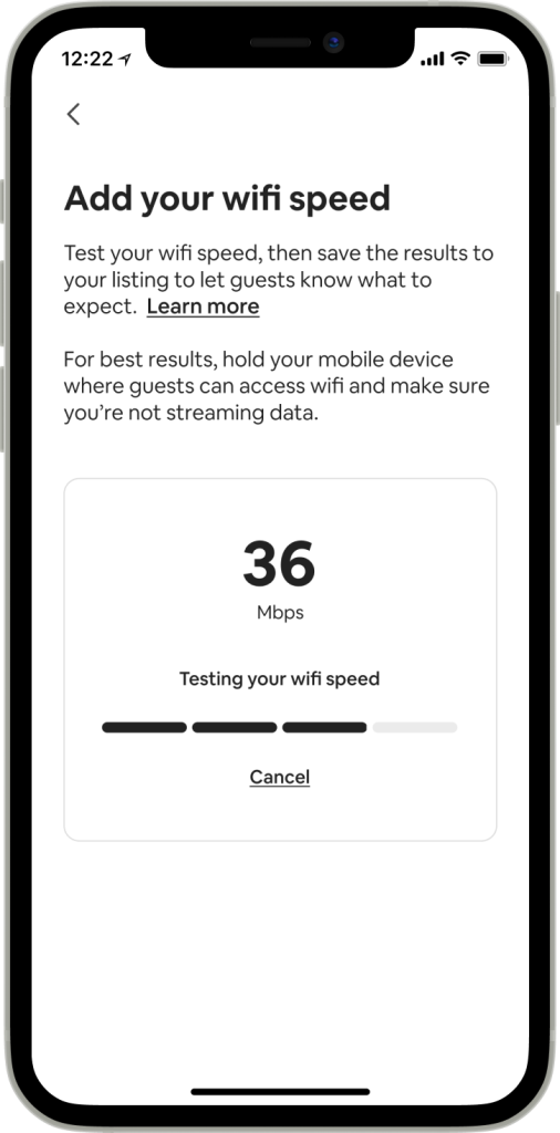 Bien que les hôtes aient pu ajouter manuellement la vitesse du wifi sur leurs pages d’annonces depuis un certain temps, nous proposons désormais une solution simple et efficace pour leur permettre de mesurer la vitesse du wifi dans leur annonce en utilisant l’application Airbnb.