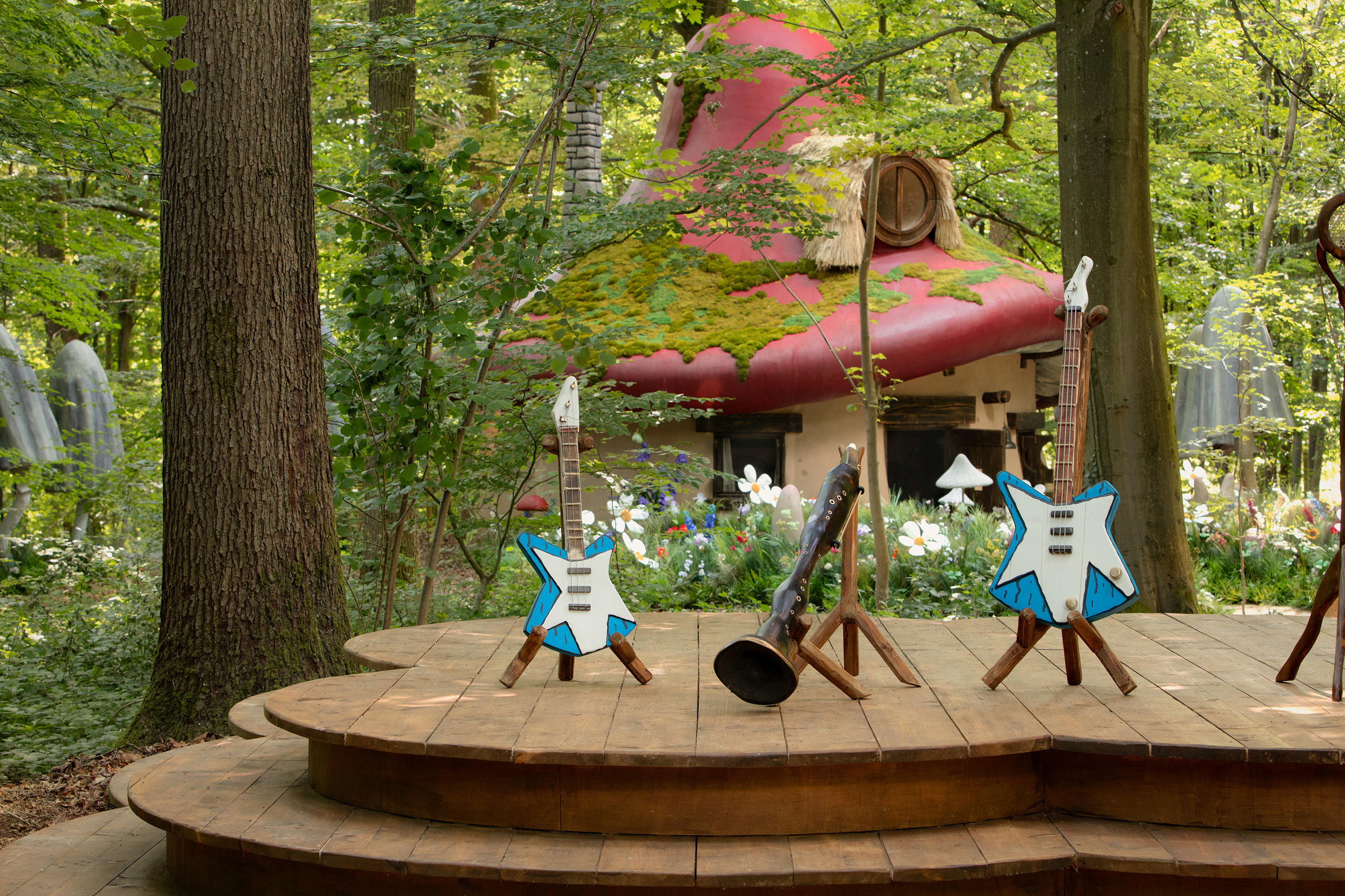 • Accueil : les voyageurs feront leur entrée dans la forêt et arriveront devant la maison en forme de champignon du Grand Schtroumpf, où ils seront accueillis par leur hôte.