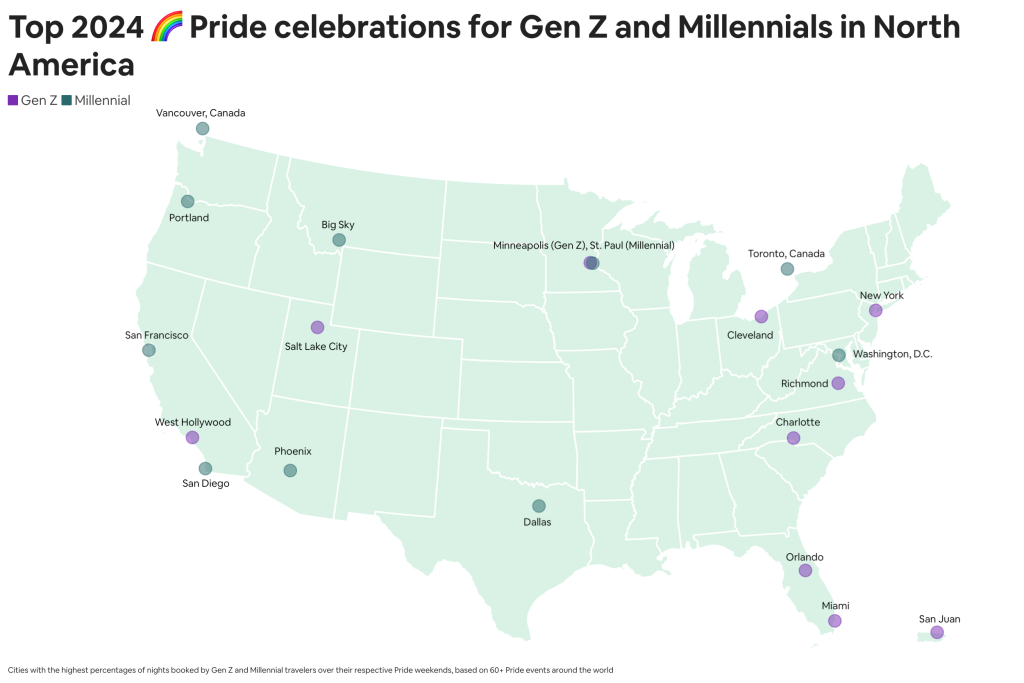 - Millennials continue to lead bookings to traditional Pride celebration destinations, maintaining their strong presence and celebrating in familiar spaces, while Gen Z is exploring both the newer Pride celebrations and traditional ones.