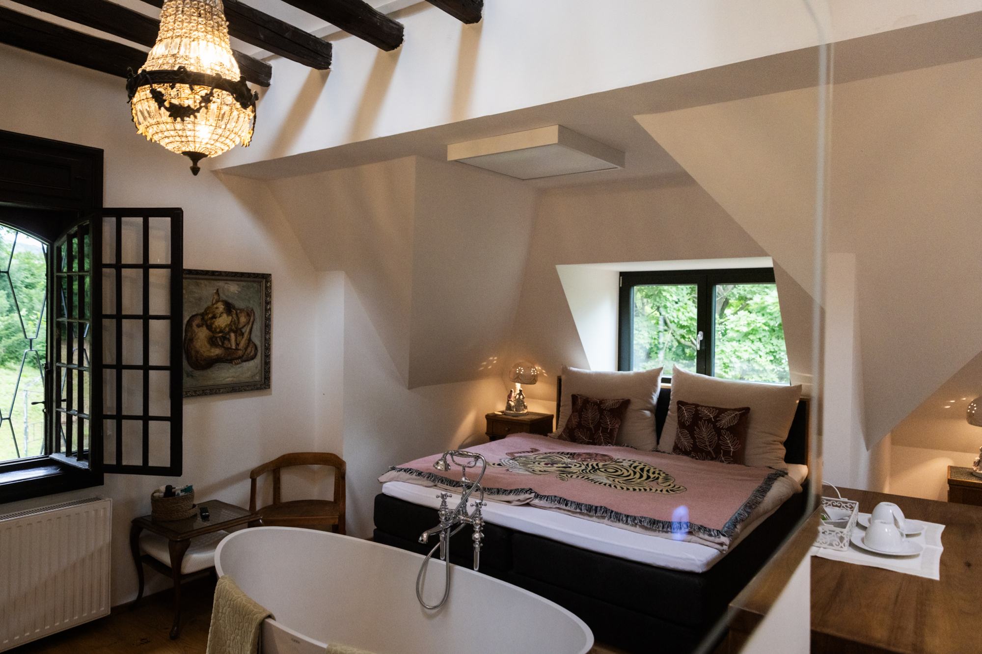 We have three double rooms, and guests have the option to stay in one of these overnight, or they can rent out the entire building for bigger events, such as weddings. They can move around freely inside and outside, sit on the terrace or by the fireplace in the garden. It was very important to us that everything is designed so clearly and simply that everyone knows their way around and feels at home immediately.