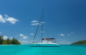 A large 14 metres catamaran parked in the marina in downtown Papeete. You can enjoy Papeete with restaurants or food trucks nearby. You can choose to anchor at the lagoon of Tahiti in a 3 metres of crystal clear water or sail to explore the other islands.