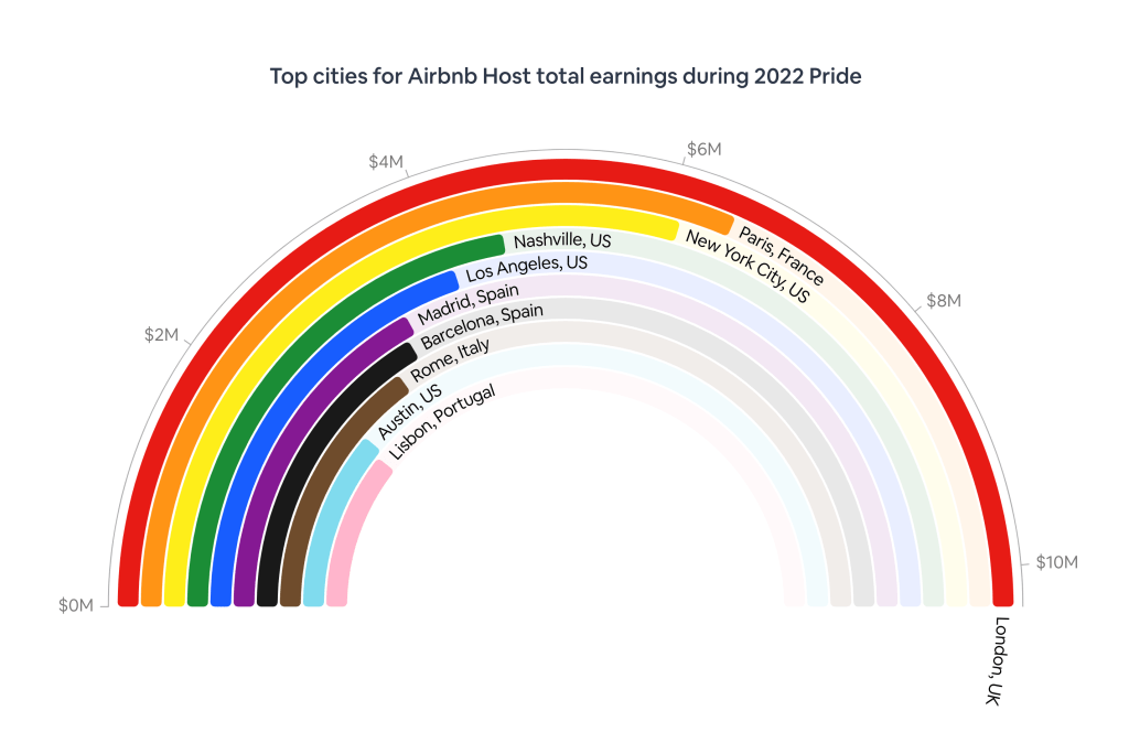 As we look forward to a season of celebration, we also recognize the potential for our Host community to earn and contribute to their local economies during Pride Month as people look to explore and participate in Pride festivities around the world. In fact, across the top 40 Pride destinations worldwide, Hosts collectively earned more than $77 million during their respective Pride celebration weekends3. These leading locales not only promise unforgettable Pride celebrations but also offer tremendous earning potential for those interested in hosting on Airbnb.